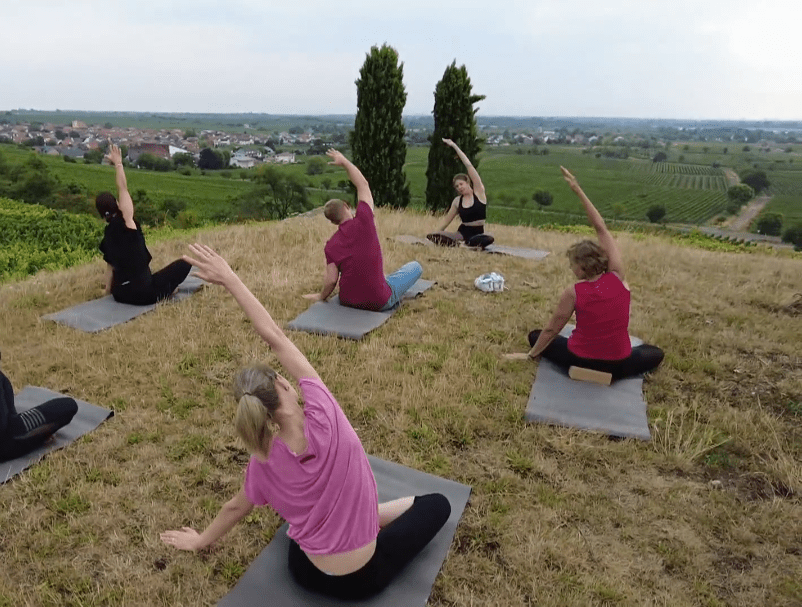- Ca. 45 Minuten Vinyasa-Yoga für alle Erfahrungslevel auf dem Herrenberg inmitten der Weinberge – ca. 15 Minuten Fußweg (bei schlechtem Wetter im Gartensaal)