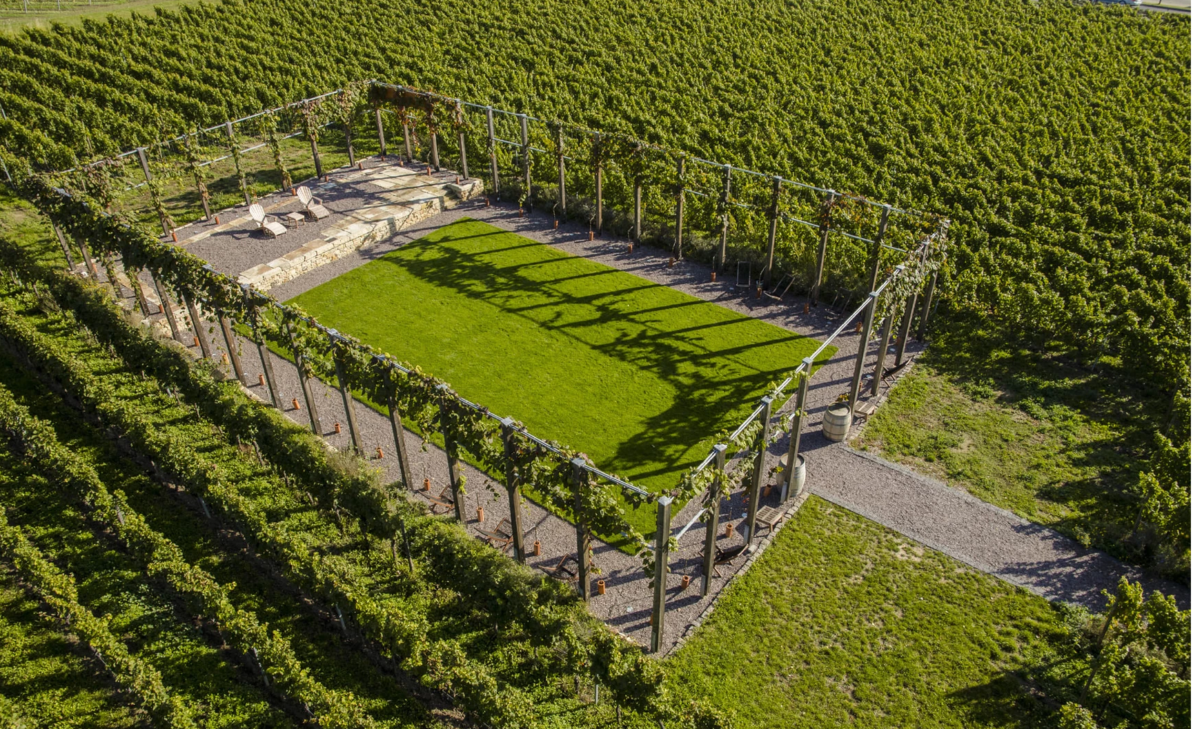 in Form einer von Reben umrankten Arena, in der sich Menschen begegnen.